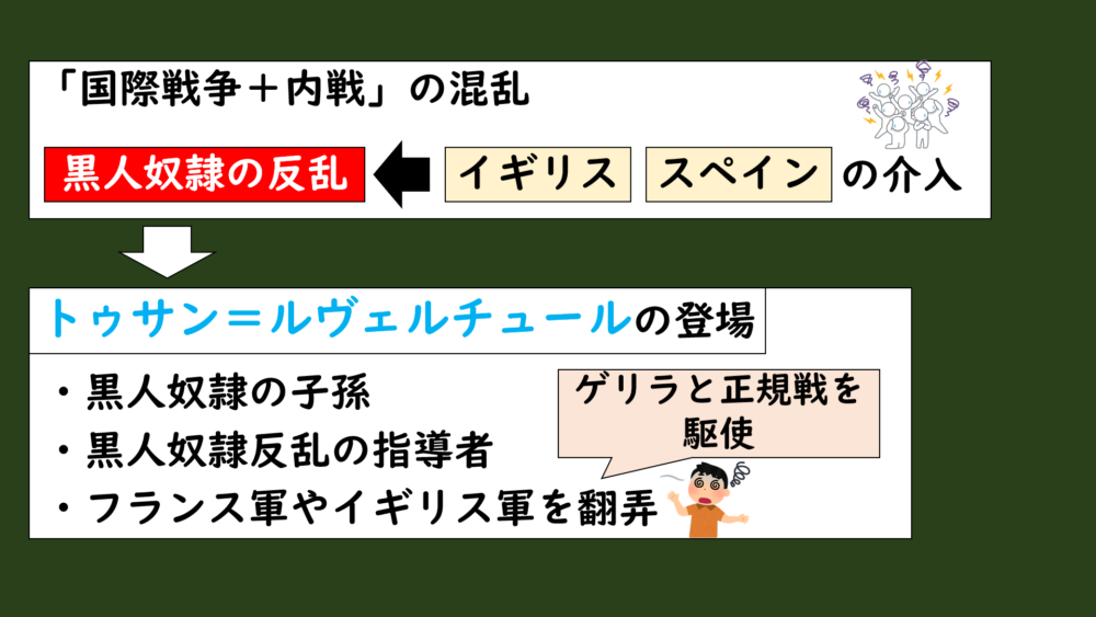 この黒人奴隷の反乱による混乱に乗じて、フランス植民地を乗っ取りたいイギリスとスペインも介入してきて、サン=ドマングは「国際戦争+内戦」という複雑な構図になっていきました。