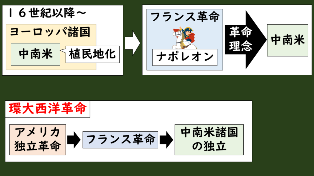 アメリカ独立革命から始まり、フランス革命、そして今回の中南米諸国で独立運動と、大西洋周辺で起きた一連の革命の流れを環大西洋革命と言います。