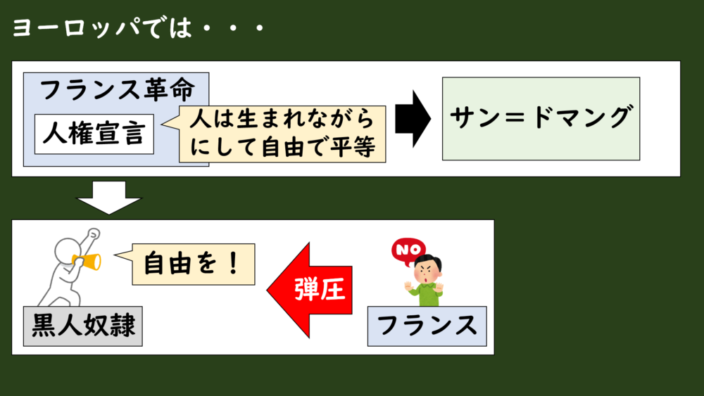 しかも、革命政府は「人権宣言」の理念は、“本国の白人男性市民”を想定していたので、黒人奴隷はそこに入っていなかったんです。