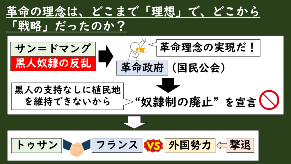 革命理念が自由・平等という理念だけで動いたわけではなく、黒人勢力の支持を得て植民地を維持するという軍事・外交上の現実とも結びついていた。