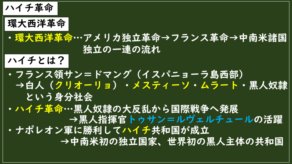 今回から中南米諸国の独立についてです。今回はフランス革命に影響を受けたハイチ革命についてみていきます。このハイチ革命にはどんな特徴があったんでしょうか?