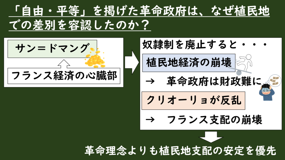 フランス革命政府が植民地の砂糖産業が生む莫大な利益を失うことを恐れ、植民地の白人支配層の反発も避けたかったため、理念より経済と支配維持を優先し、差別を容認した。